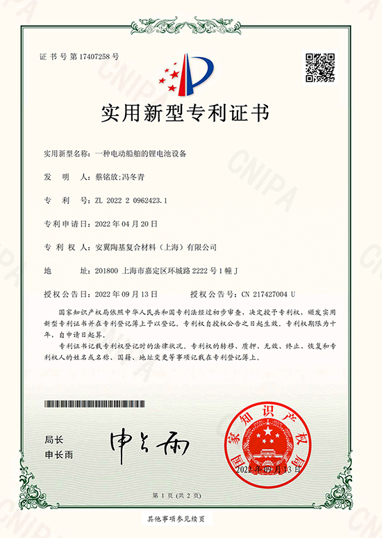 安翼陶基-一种电动船舶的锂电池设备专利证书
